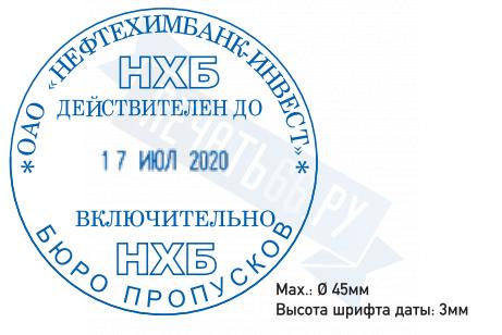 Ø 45 мм, высота даты: 3 мм. Со встроенной окрашенной штемпельной подушкой синего цвета.