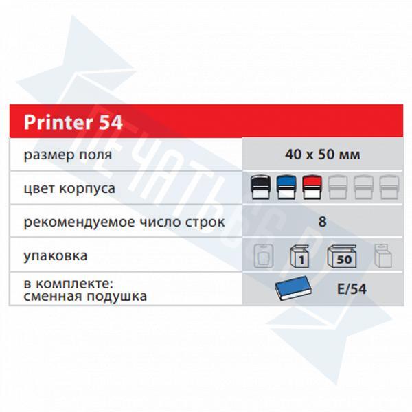 Оснастка Colop Printer 54 имеет: окно персонализации, клеевой слой для крепления клише печати. Штемпельная подушка: сменная, синяя, в комплекте.