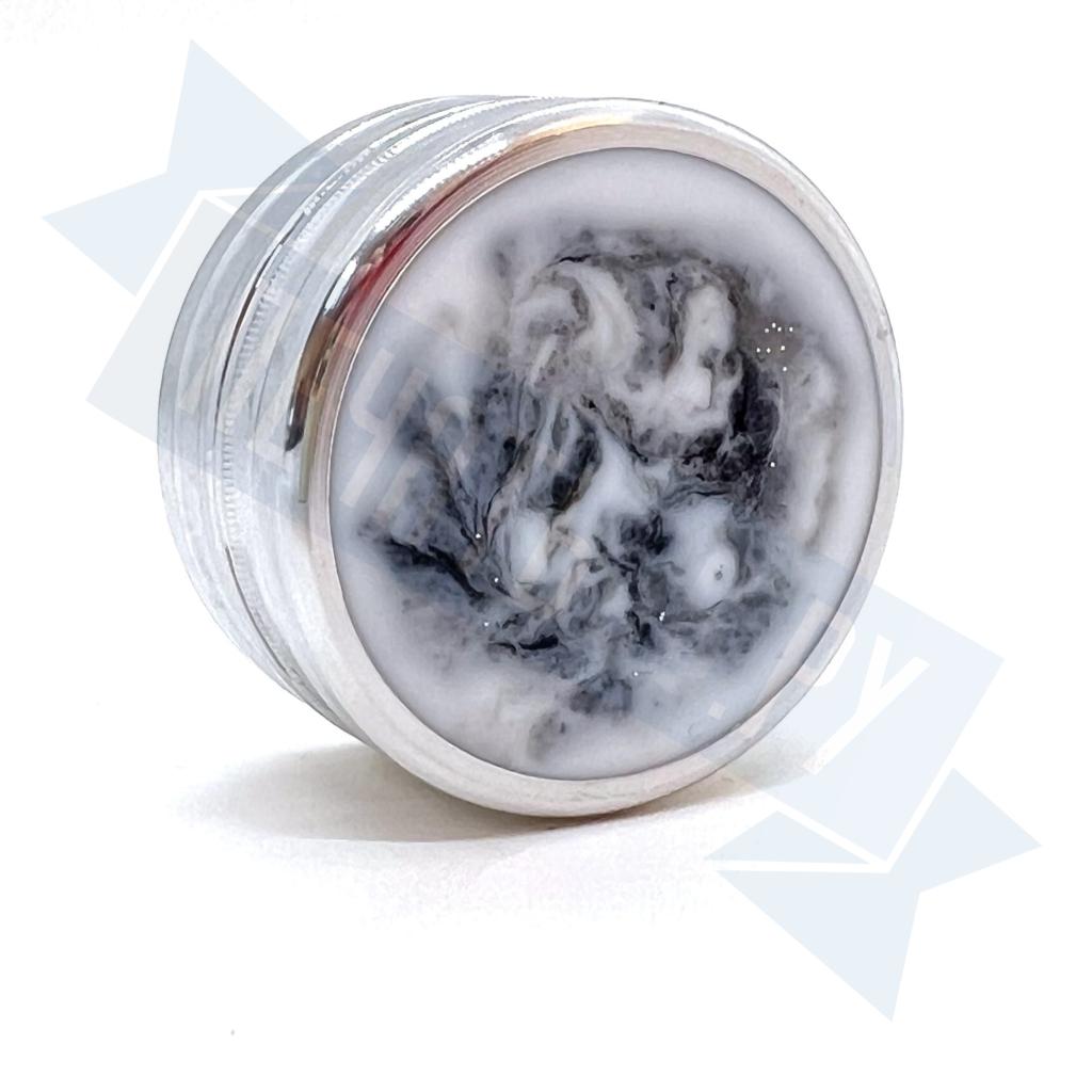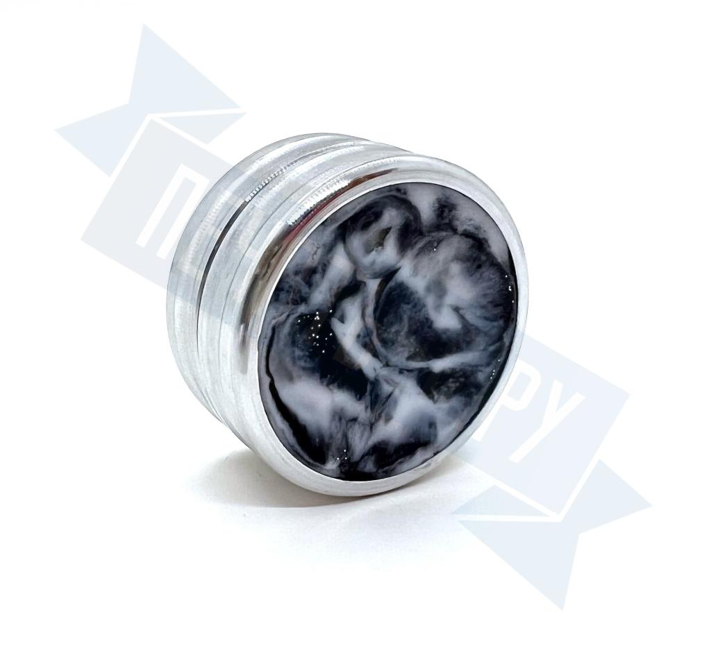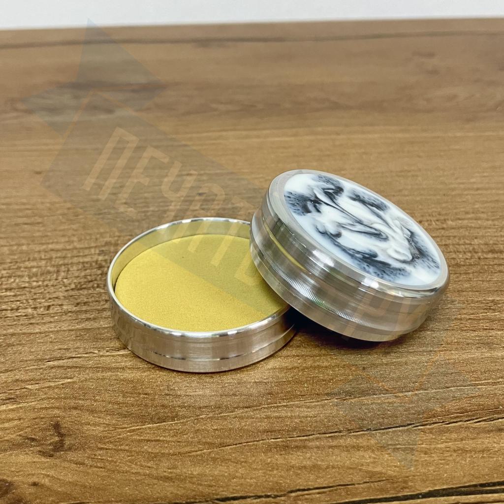 Металлическая оснастка для круглой печати со встроенной неокрашенной штемпельной подушкой. Благодаря встроенному магниту, крышку не нужно закручивать. В качестве декора на крышке и корпусе оснастки использованы вставки из акрила